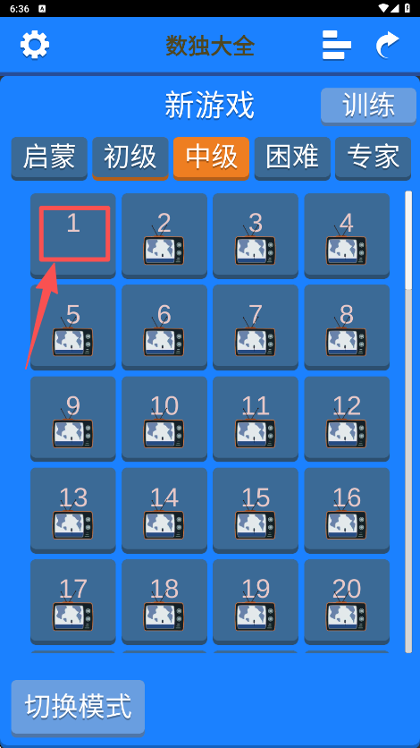 1、在 “新游戏” 页面选好难度(如中级),点击对应关卡(如 1),即可进入数独对局。