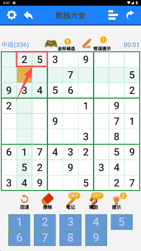 2、进入数独界面后,点击目标空格,再选下方数字填入,完成该格的数字填写。