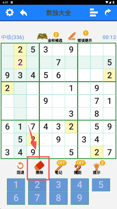 3、若填错数字,点击下方 “擦除” 按钮,可清除当前空格内错误的数字。