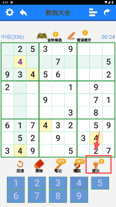 4、遇到难题时,点击下方 “提示” 按钮,可获取该空格对应的正确数字提示。