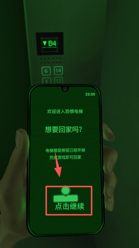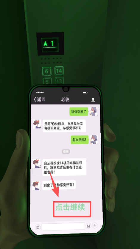 4、看到手机里的游戏提示后,点击 “点击继续” 按钮,进入后续的电梯解谜环节。