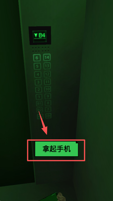 3、在电梯楼层按钮界面,点击 “拿起手机” 按钮,获取手机道具来推进游戏流程。