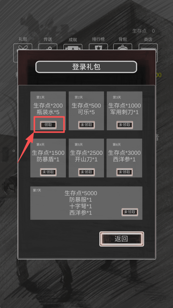 2、在登录礼包界面点击 “领取”,获取第 1 天的生存资源奖励。
