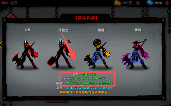 2、选择 “孙悟空” 英雄,查看其属性后进入对应的关卡战斗。