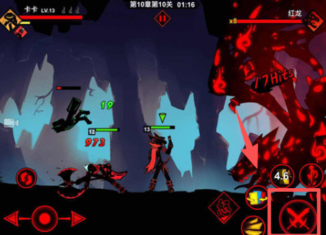 3、在战斗中点击攻击按钮,对 “红龙” 敌人造成伤害推进战斗。
