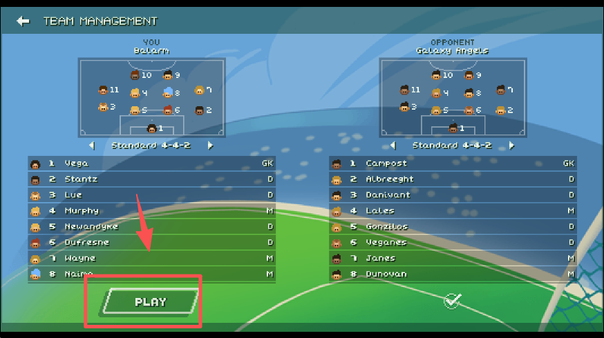 3、确认阵容后点击 “PLAY” 按钮,进入与对手的足球比赛。