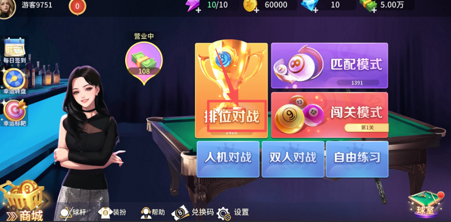 2、选择 “排位对战” 模式,进入与其他玩家的台球竞技对局。