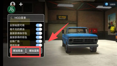 1、在 MOD 菜单中选择功能后,点击 “增加金钱” 获取游戏资源,为车辆改装做准备。