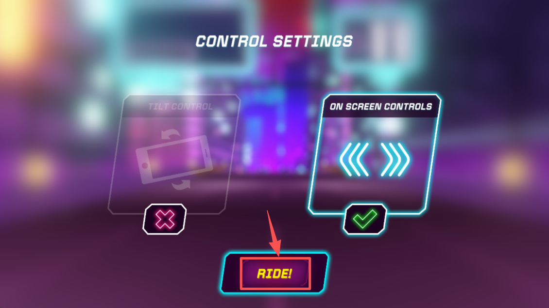 1、确认 “屏幕控制” 方式后点击 “RIDE!”,进入霓虹摩托的跑酷场景。