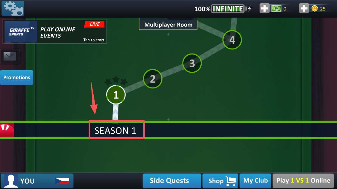 1、选择 “SEASON 1” 赛季,进入斯诺克比赛的关卡选择界面。
