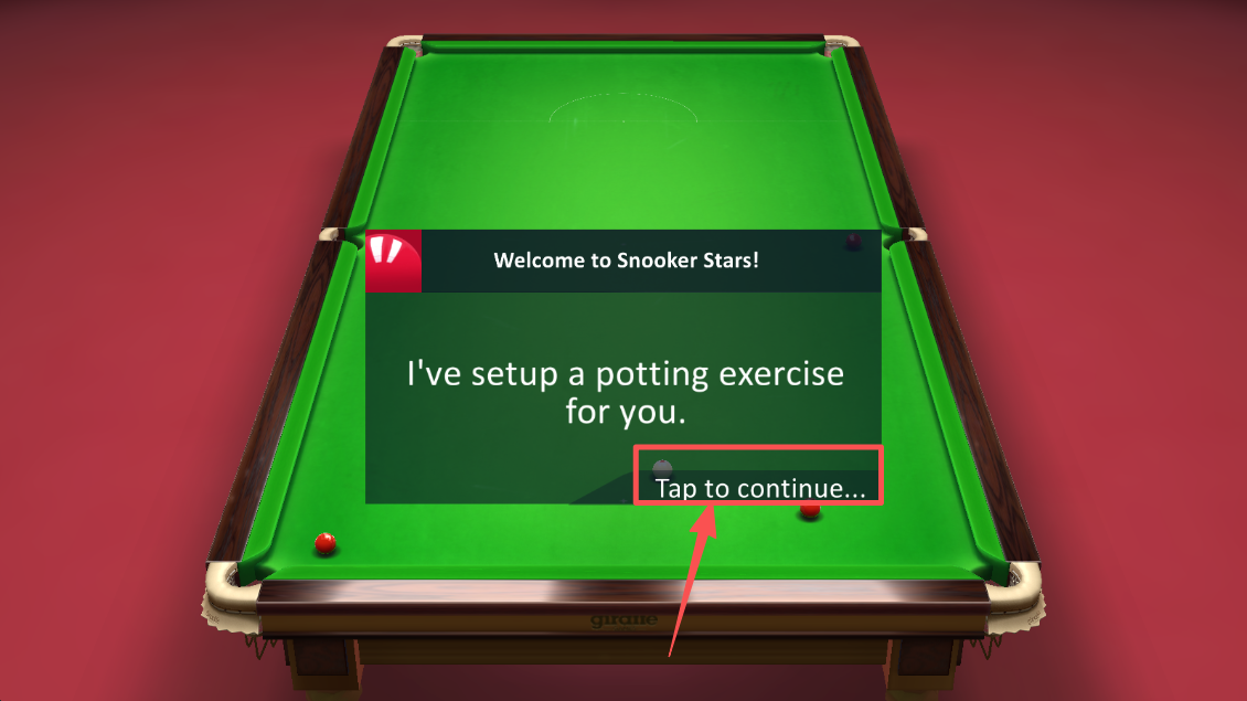 3、轻按 “continue” 跳过提示,开始斯诺克的击球训练关卡。