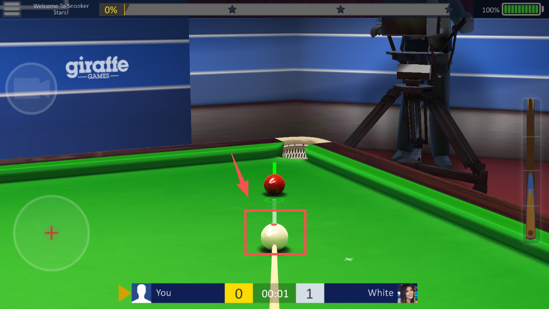 4、调整白球位置瞄准红球,完成击球练习以熟悉游戏操作。