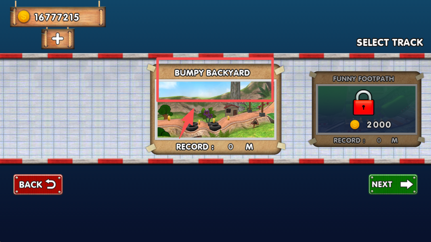 3、选定 “BUMPY BACKYARD” 赛道,准备开始沙地赛车挑战。