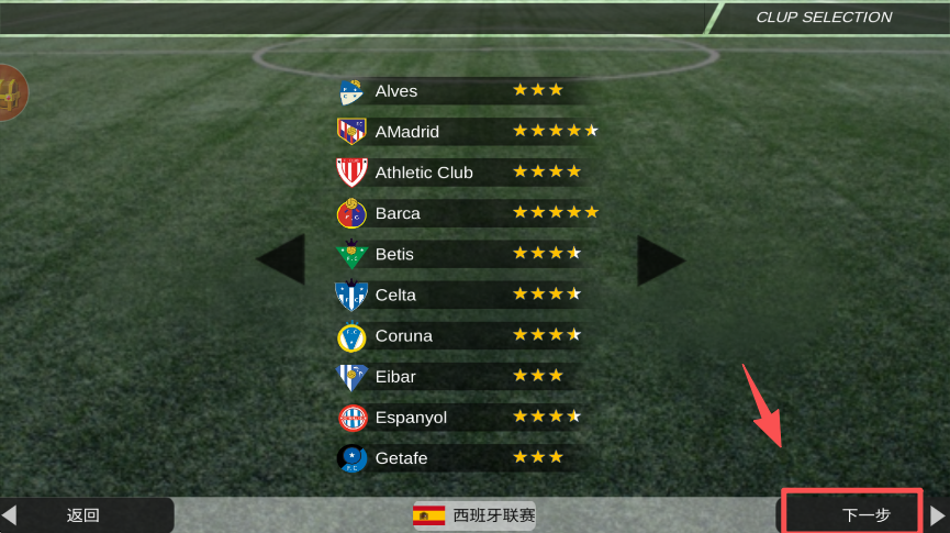 2、选择 “西甲联赛”,进入该赛事的俱乐部选择环节。