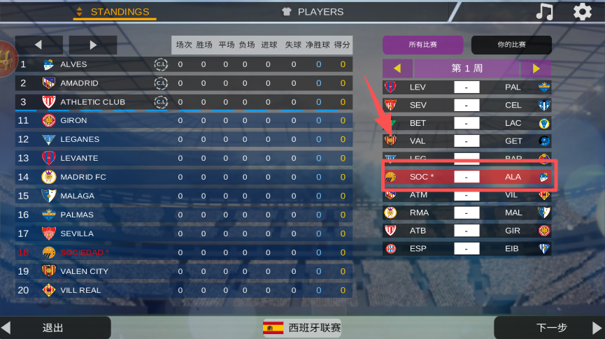 3、选定俱乐部后点击 “下一步”,进入联赛的赛程界面。