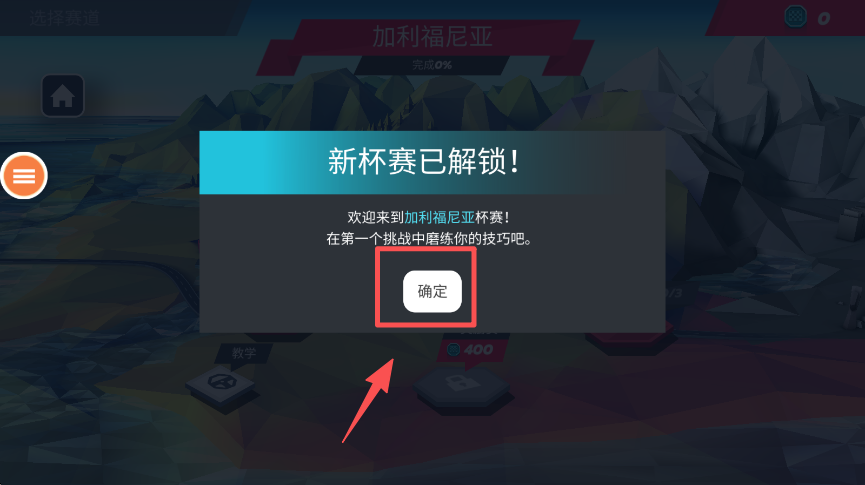 1、点击 “确定” 按钮,关闭杯赛解锁提示并进入赛道选择界面。