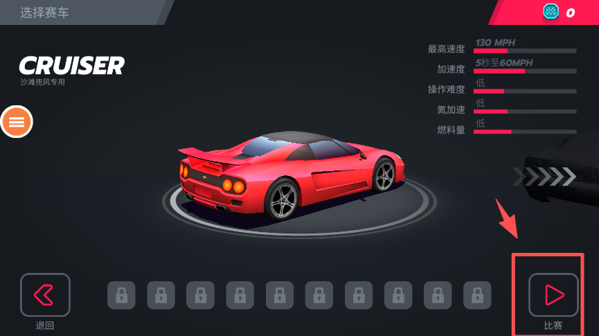 3、选定红色赛车后点击 “比赛”,准备开始首场赛事挑战。