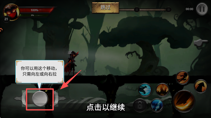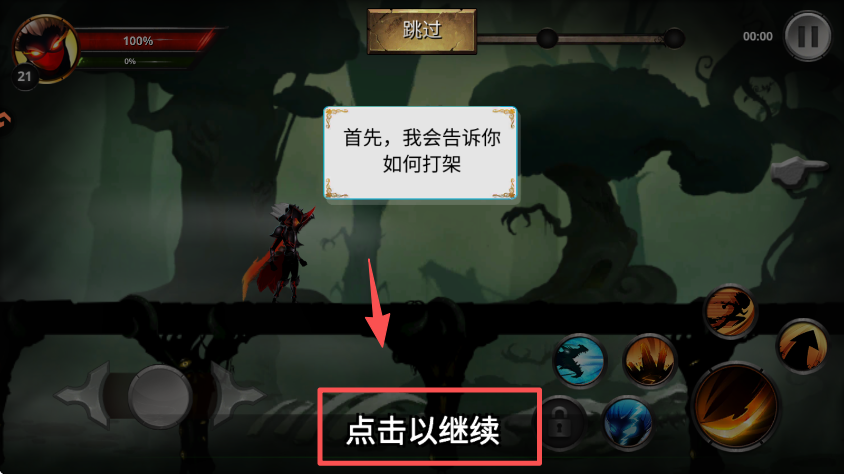 2、进入教学界面后,看到 “点击以继续” 提示,点击它推进格斗教学内容。