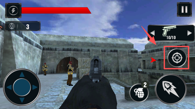 2、找到界面右侧的瞄准按钮并点击,可精准锁定敌人,为后续成功击中目标创造有利条件。