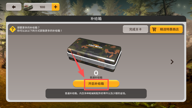 2、进入补给箱界面后,点击 “开启补给箱” 按钮,可获取箱内的枪械配件、少量金钱等物资。