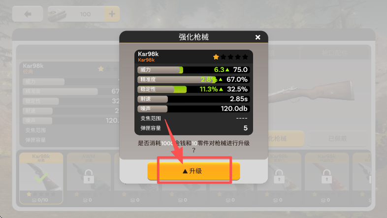 4、在强化枪械的弹窗里,确认资源消耗后点击 “升级” 按钮,提升 Kar98k 枪械的各项属性。