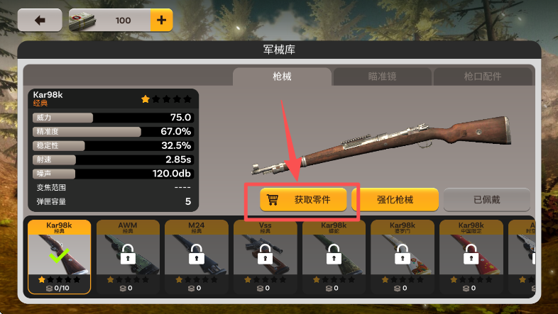 3、进入军械库的枪械界面,点击 “获取零件” 按钮,获取对应枪械的零件以便后续强化。