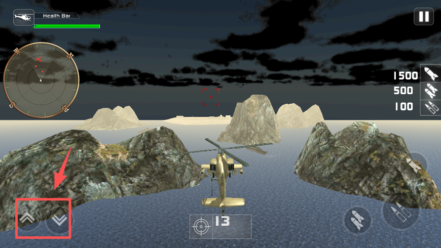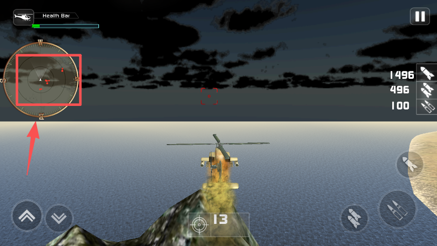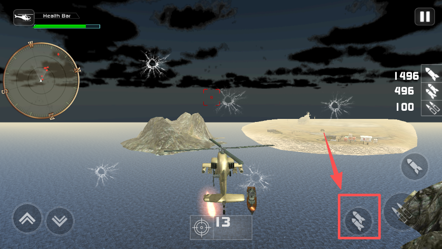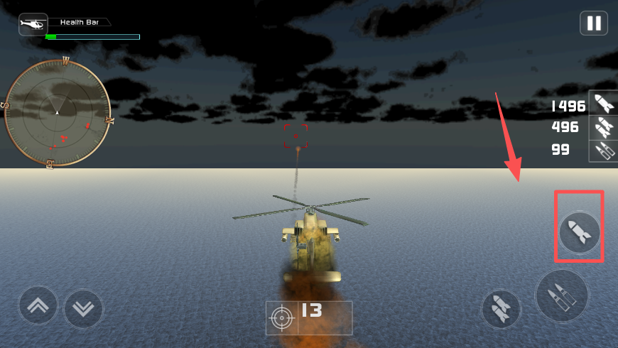 2、当直升机遭敌人攻击时,点击右侧的火箭按钮,发射火箭对敌方目标展开反击行动。