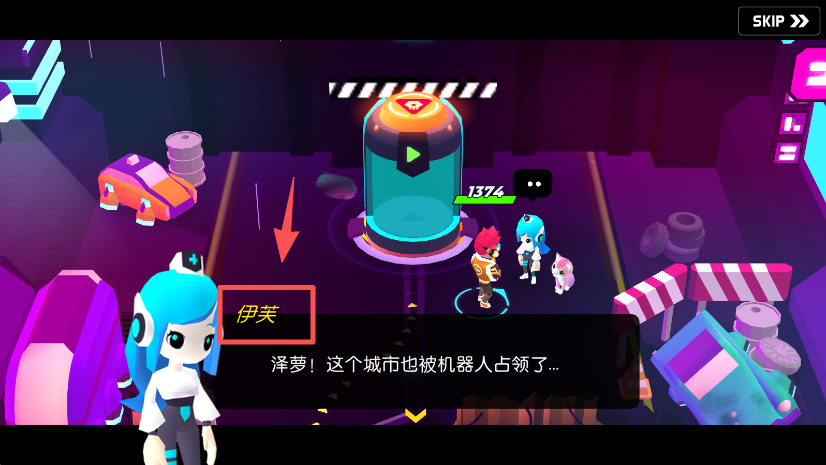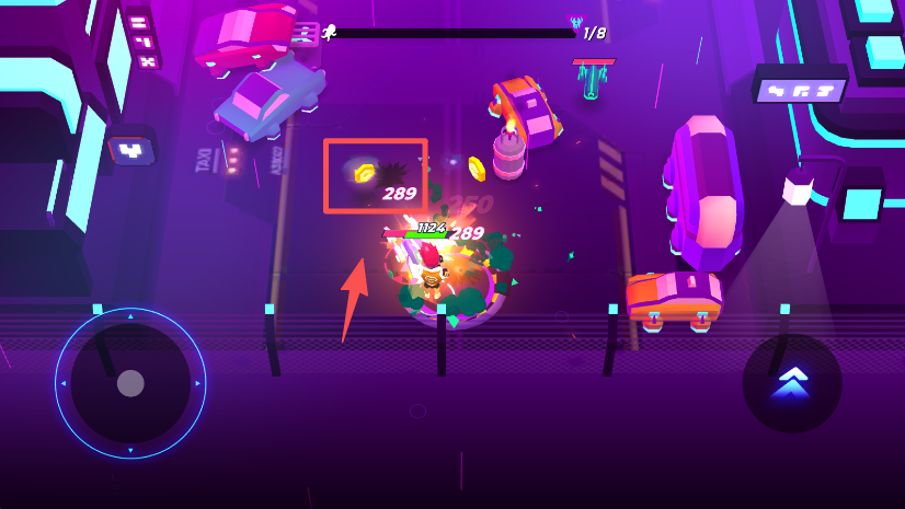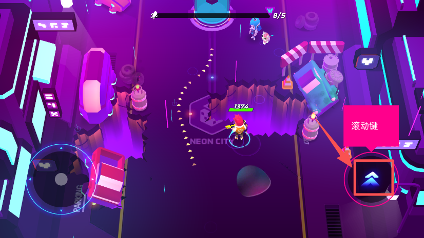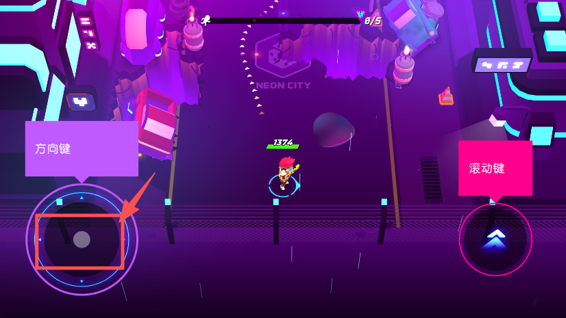 1、操控左侧方向键,控制游戏角色在霓虹场景中移动。