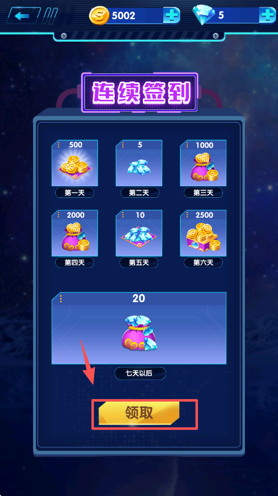 3、在连续签到界面点击 “领取”,获取对应的签到奖励道具。
