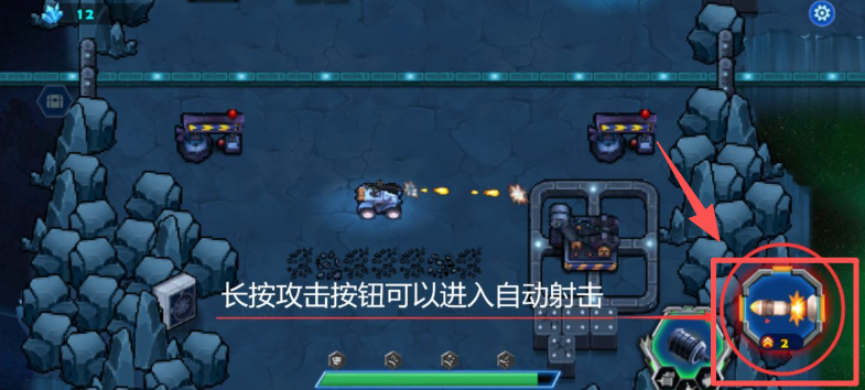 2、找到界面右侧的攻击按钮,长按该按钮就能让机甲开启自动射击模式。