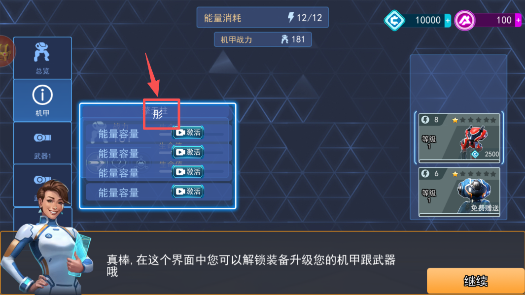3、进入机甲界面后,可在此解锁、升级机甲与武器,完成操作后点击 “继续”,推进新手引导步骤。