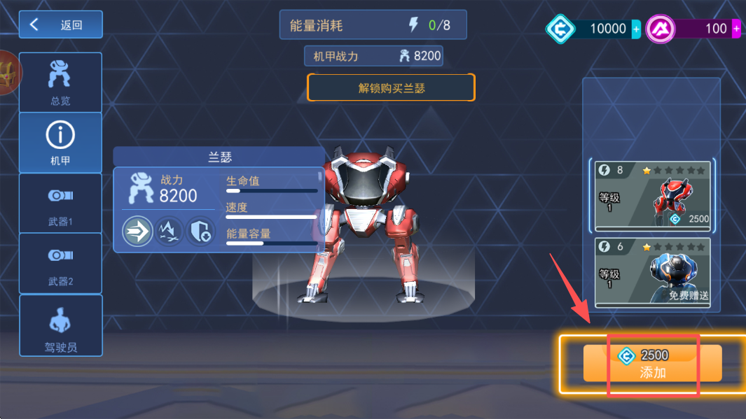 4、在机甲界面解锁兰瑟机甲后,点击界面下方的 “添加” 按钮,即可将该机甲配置到可使用列表中。