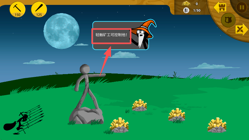 4、进入对局后,按提示轻触矿工,完成对该单位的控制操作。