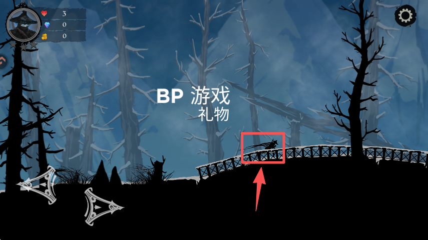 3、持续用左下角操作按钮,让忍者角色在树林场景中向前跑动推进关卡。