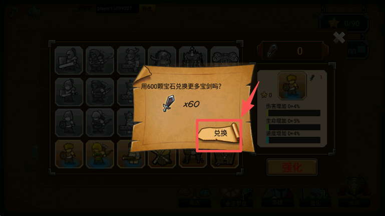 2 、在兑换弹窗中确认用 600 宝石换 60 把宝剑,点击 “兑换” 按钮获取强化道具。