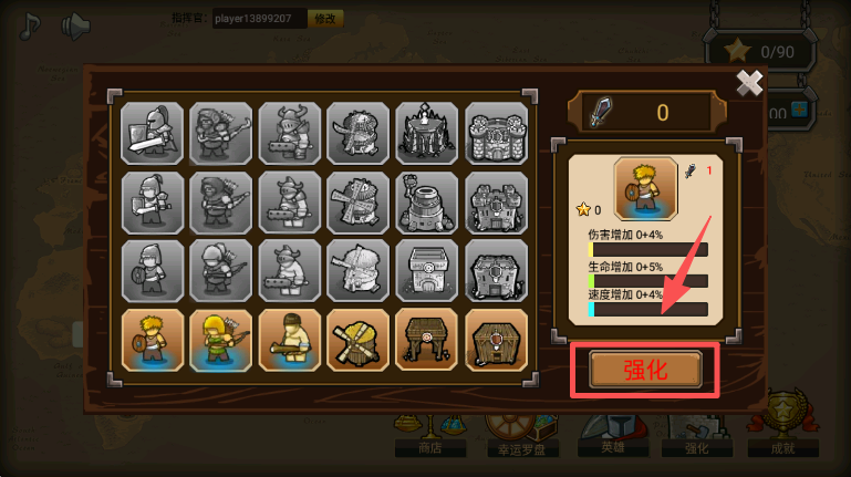 1、在强化界面选中小兵,查看其属性加成后,点击 “强化” 按钮提升该单位能力。