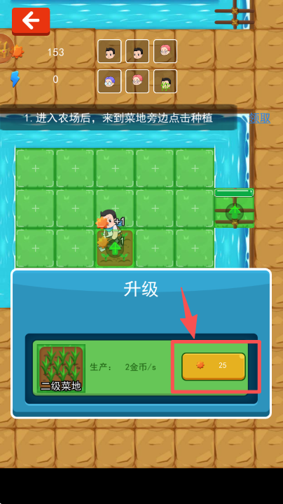 2、在菜地种植后弹出升级窗口,消耗 25 金币点击升级,提升菜地至二级。