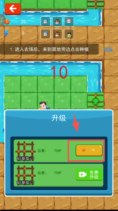 4、在农场中打开升级窗口,消耗 16 金币点击升级,提升稻草柴门的属性。
