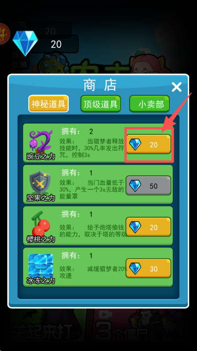 3、进入商店界面,找到 “豌豆之力” 道具,消耗 20 钻石购买该道具。