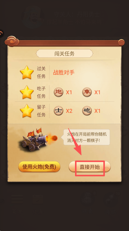 1、在闯关任务界面点击 “直接开始” 按钮,进入与守关人丹阳勇士的对局。