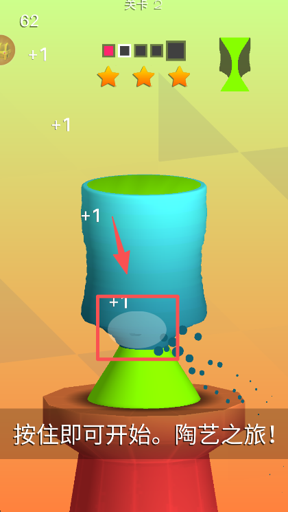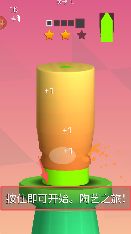 1、在关卡 1 界面按住提示区域开启陶艺操作,塑造陶艺的同时可获取 “+1” 的积分反馈。