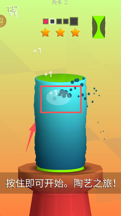 2、进入关卡 2 后按住对应区域继续陶艺塑造,调整造型的过程中会持续获得 “+1” 积分。