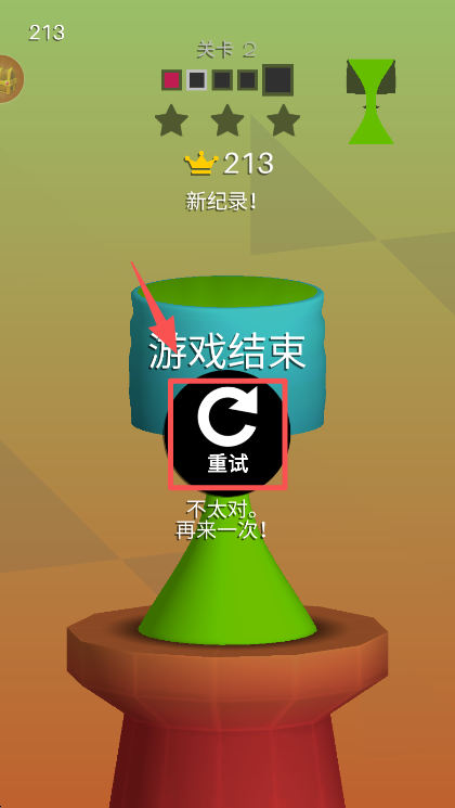 3、关卡 2 游戏结束后,点击界面中的 “重试” 按钮,重新挑战该关卡以优化陶艺造型。