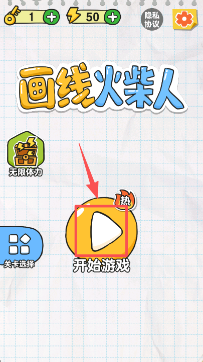 1、点击界面中间黄色的 “开始游戏” 按钮,进入画线火柴人的关卡挑战。