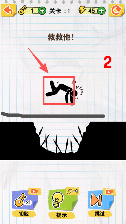 3、确认火柴人安全落在画好的线条上,完成 “救救他” 的关卡任务目标。