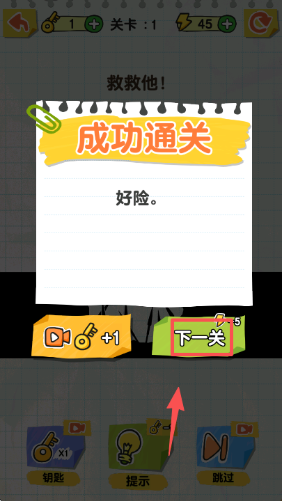 4、通关后点击界面中的 “下一关” 按钮,继续挑战画线火柴人的后续关卡。