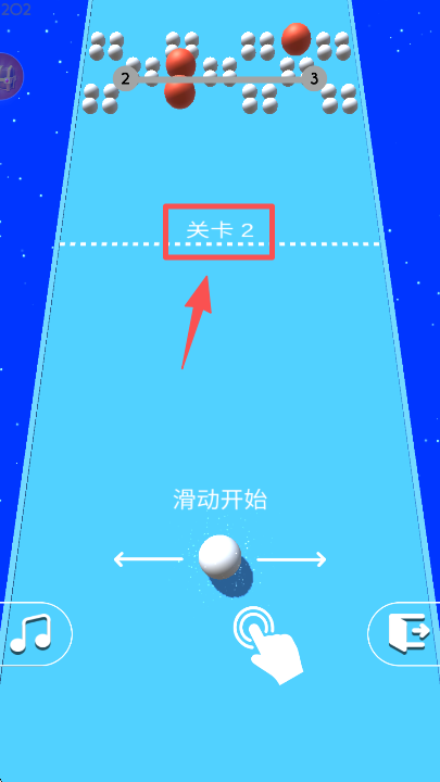 4、进入关卡 2 界面后,滑动 “滑动开始” 区域,启动白色弹珠开始本关的撞击挑战。