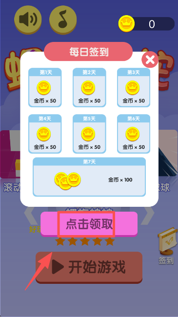 1、在每日签到弹窗中,点击粉色 “点击领取” 按钮,获取当日签到金币后关闭该弹窗。