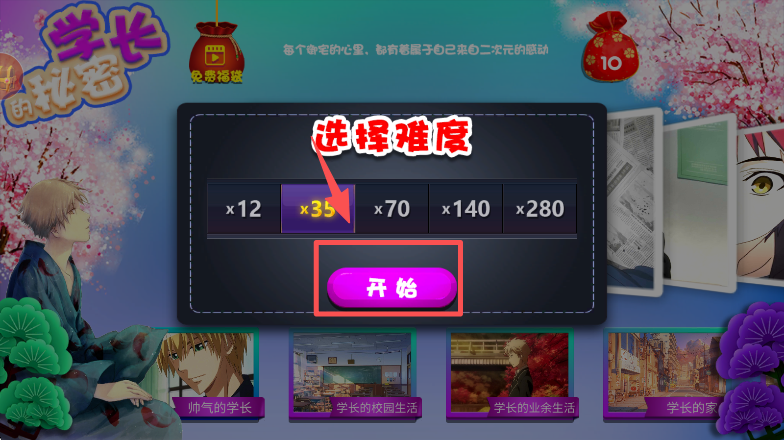 1、在游戏主界面,点击 “帅气的学长” 对应的拼图板块,进入该主题的拼图难度选择页面。