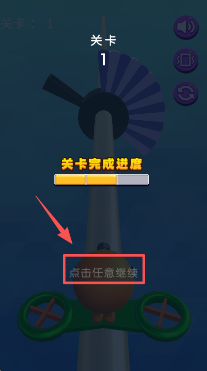 3、扇叶破坏到一定程度后,关卡进度条会填充,界面显示 “点击任意继续”,点击即可推进。